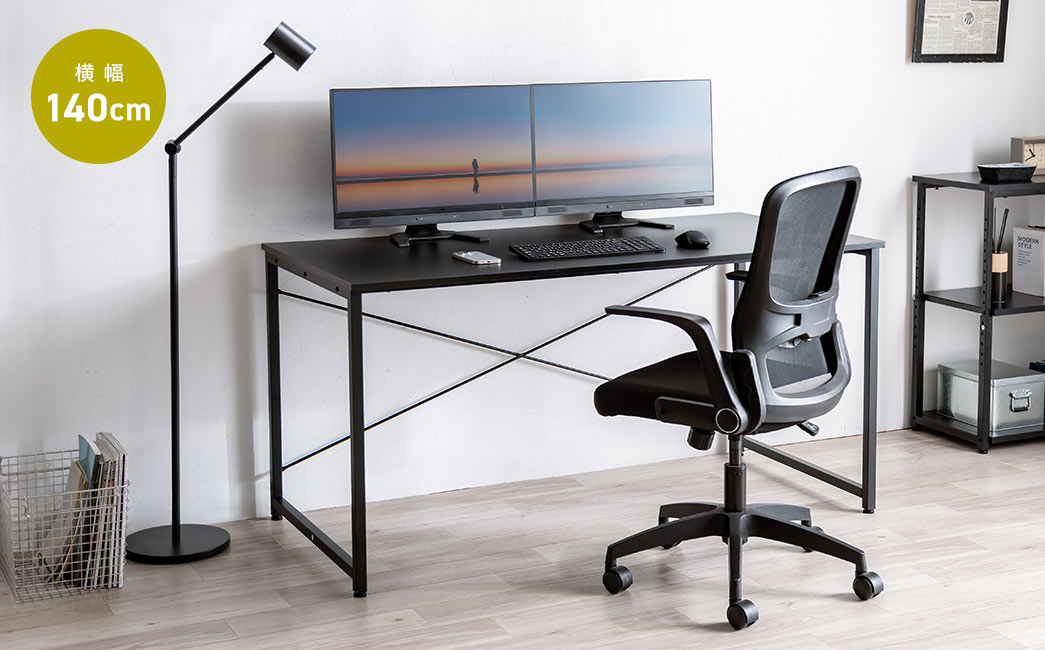 横幅140cm、奥行70cmのシンプルな平机。モニターアームなどのクランプ製品を取り付けでき、広々天板で快適に作業できるシンプルデスク。オフィスデスクやパソコンデスクとして使用できる高さ70cm仕様。ブラック。